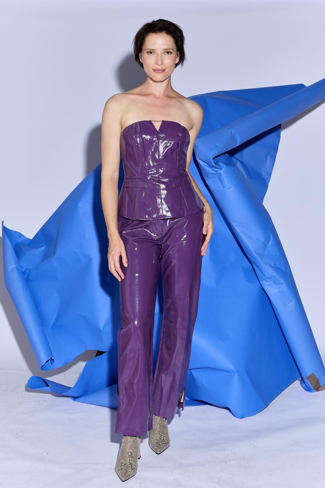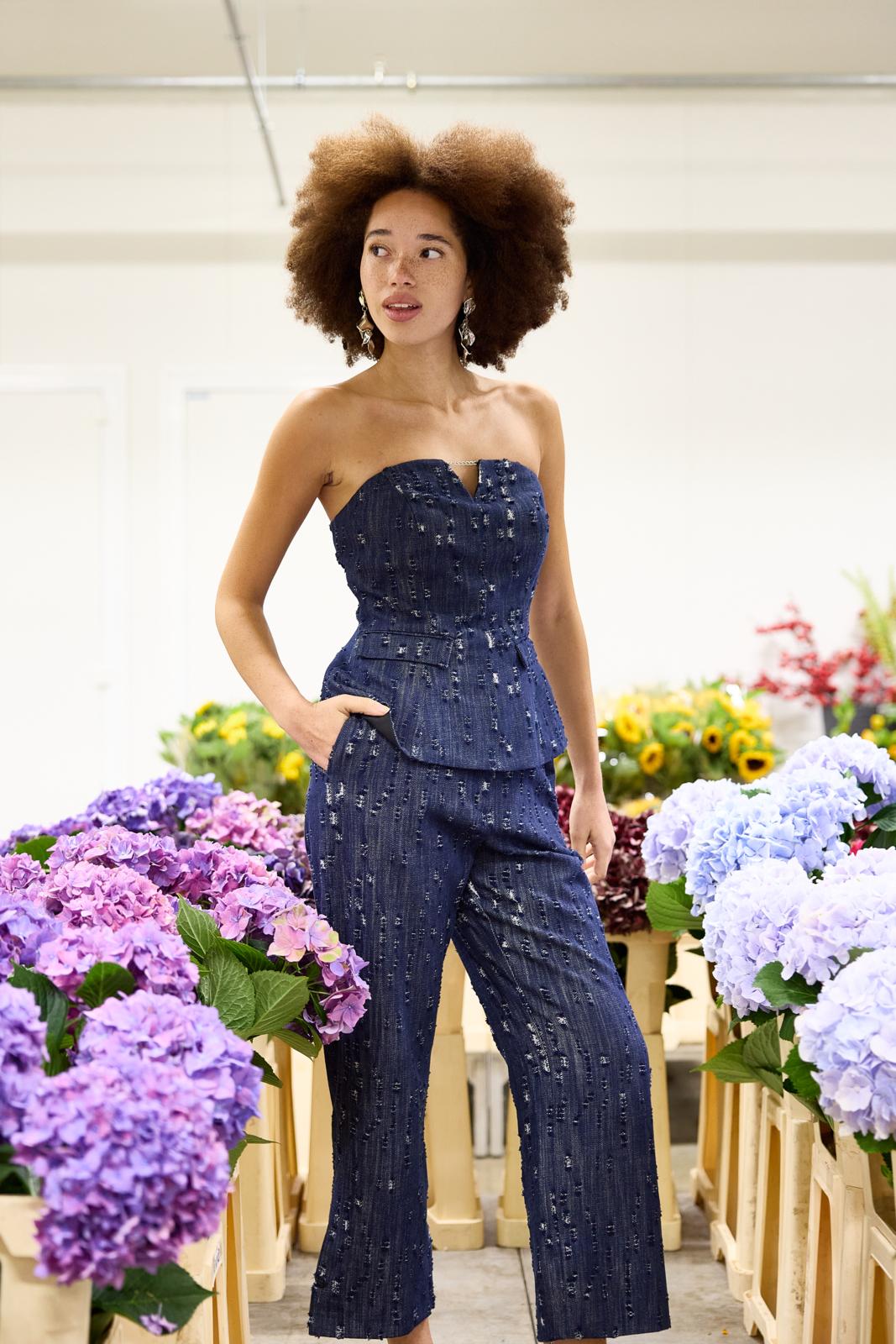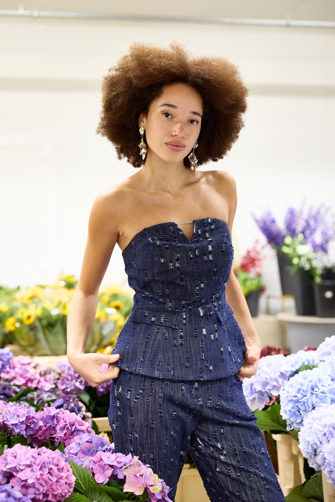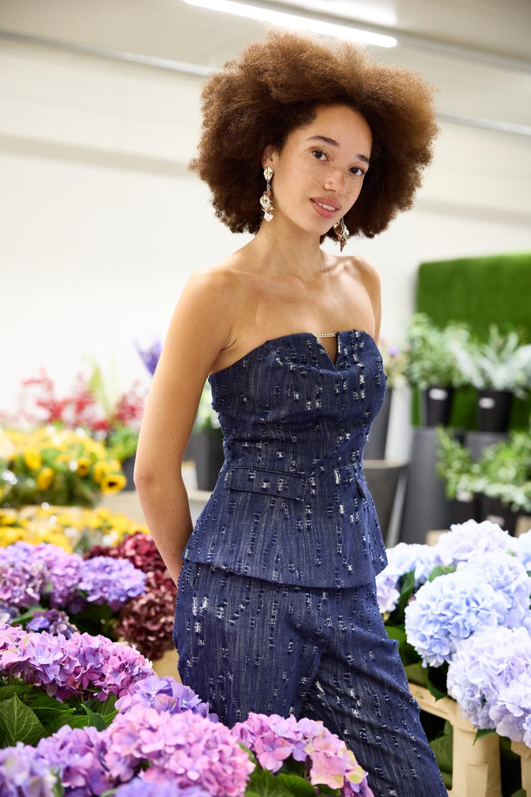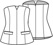 Deze wat langere 'bustier' is een flatteus, slank getailleerd model met paspelzakken met klepjes. Achter zit een blinde rits. Om hem goed op zijn plek te houden kun je antislipband – bovenaan, aan de binnenkant - stikken. Het strapless item vormt een mooie match met een broek of rok in dezelfde stof.