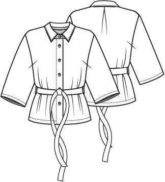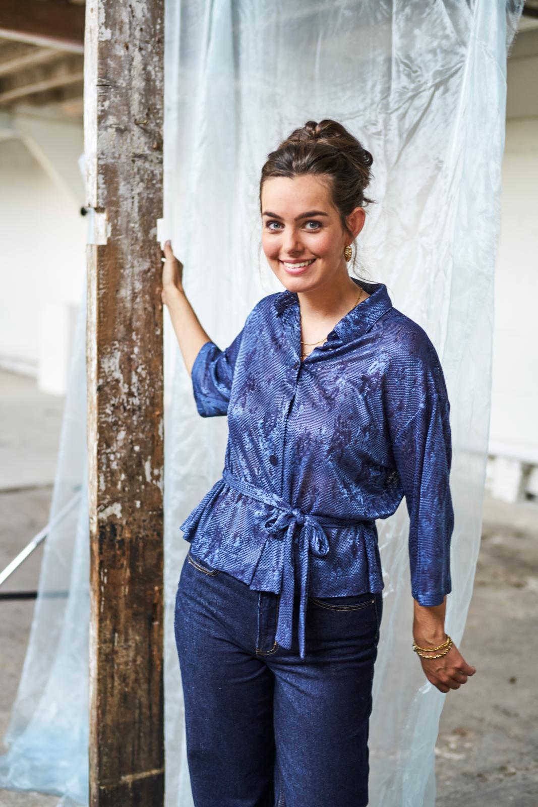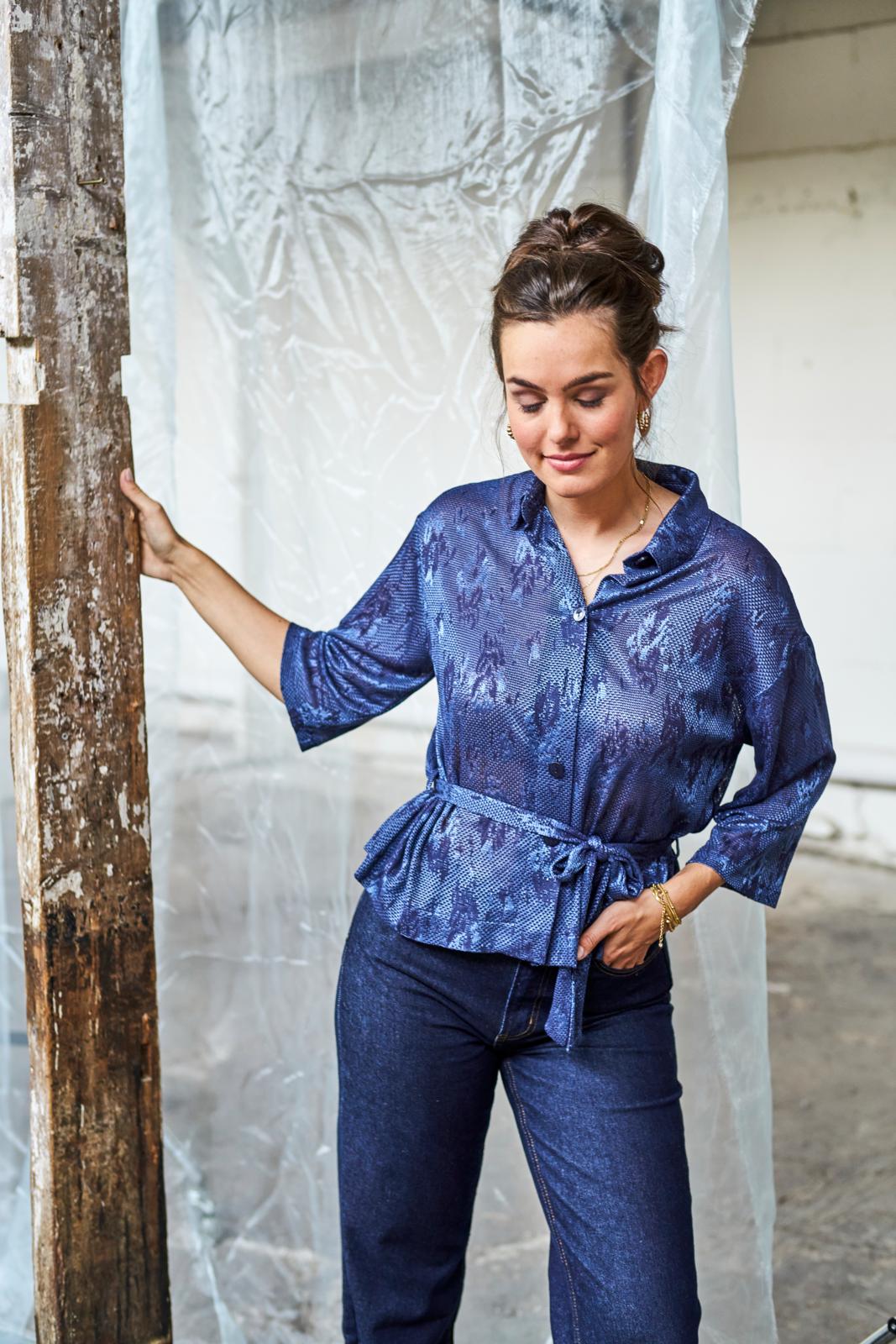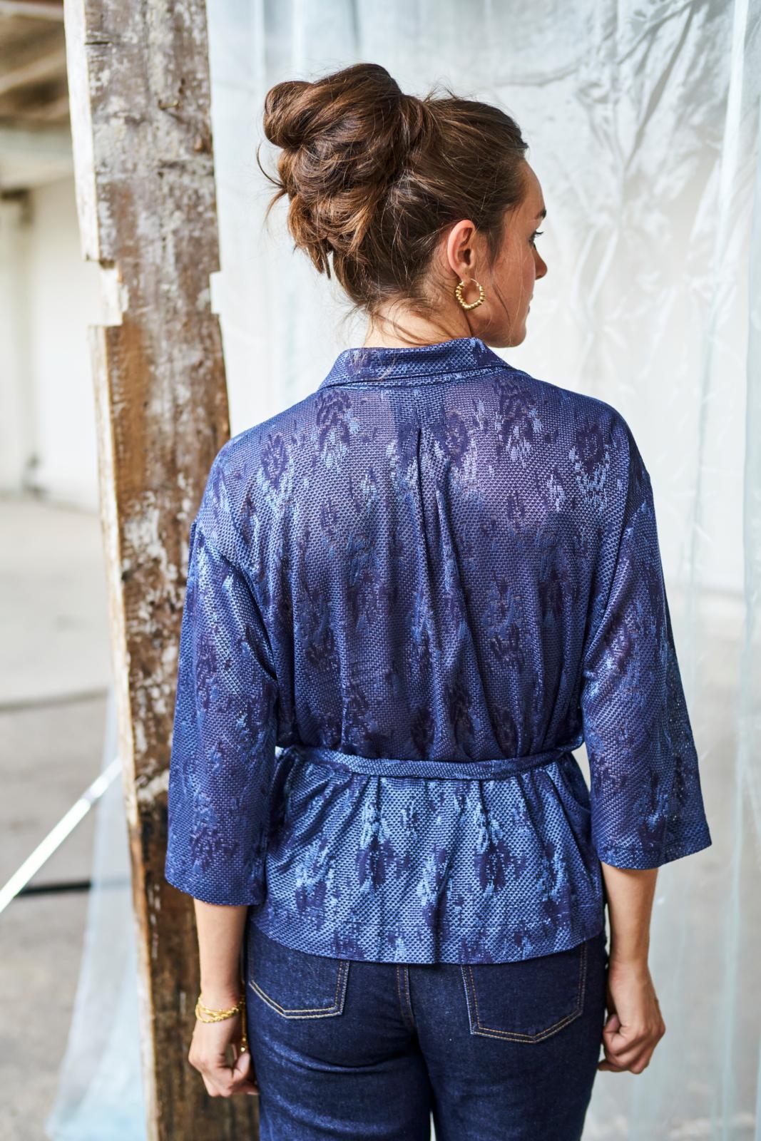 Dit eenvoudige model blouse met losse strikceintuur, springt in het oog door de kantachtige jacquardtricot met ingebreid motief. Middenachter, onder de kraag, zit een stolpplooi. Een goed model voor zowel een klassieke als stoere casual look.