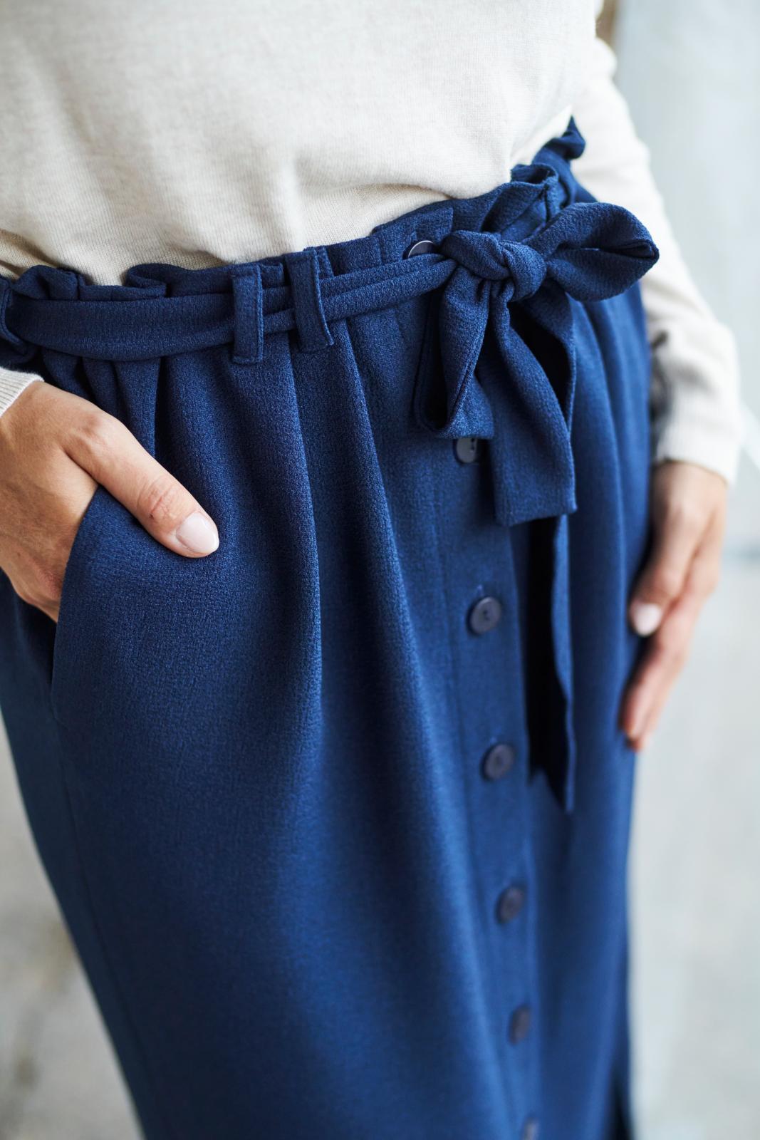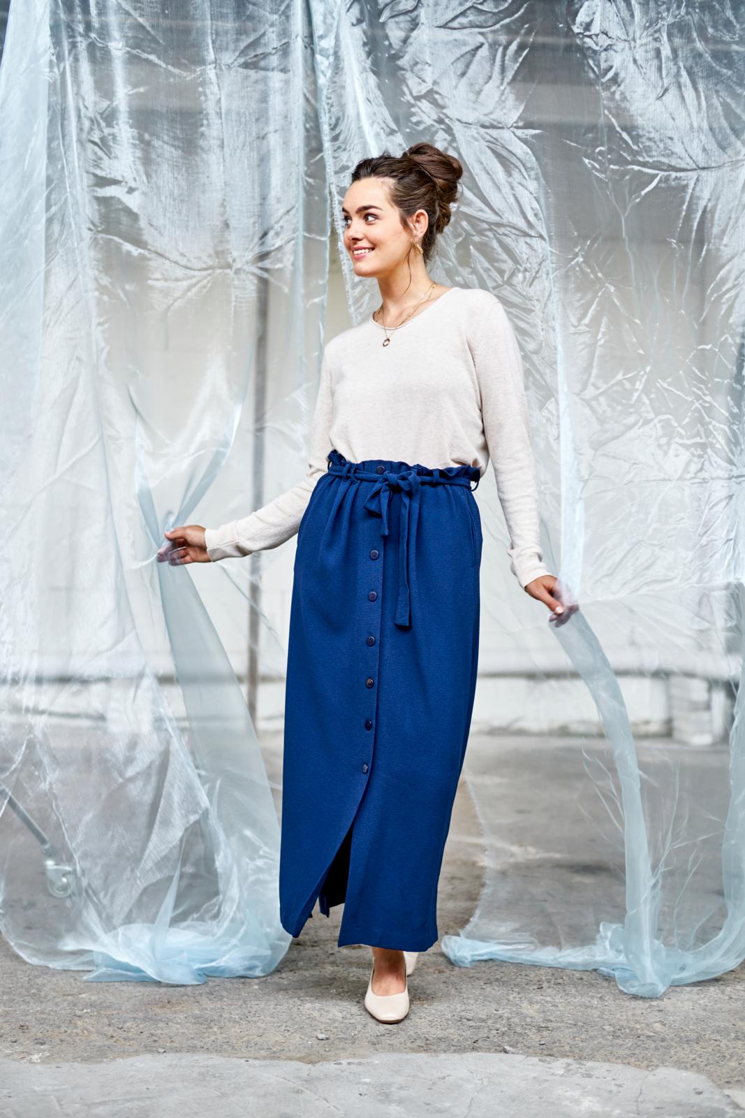 Rokken zijn hot deze winter, zoals dit makkelijk te maken doorknoopmodel met paperbag-effect: met de ceintuur snoer je de rechte bovenkant aan. Wil je hem zonder knoopjessluiting, maak dan rok 19.