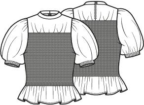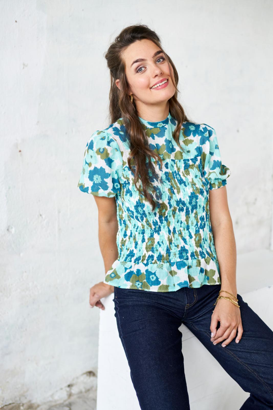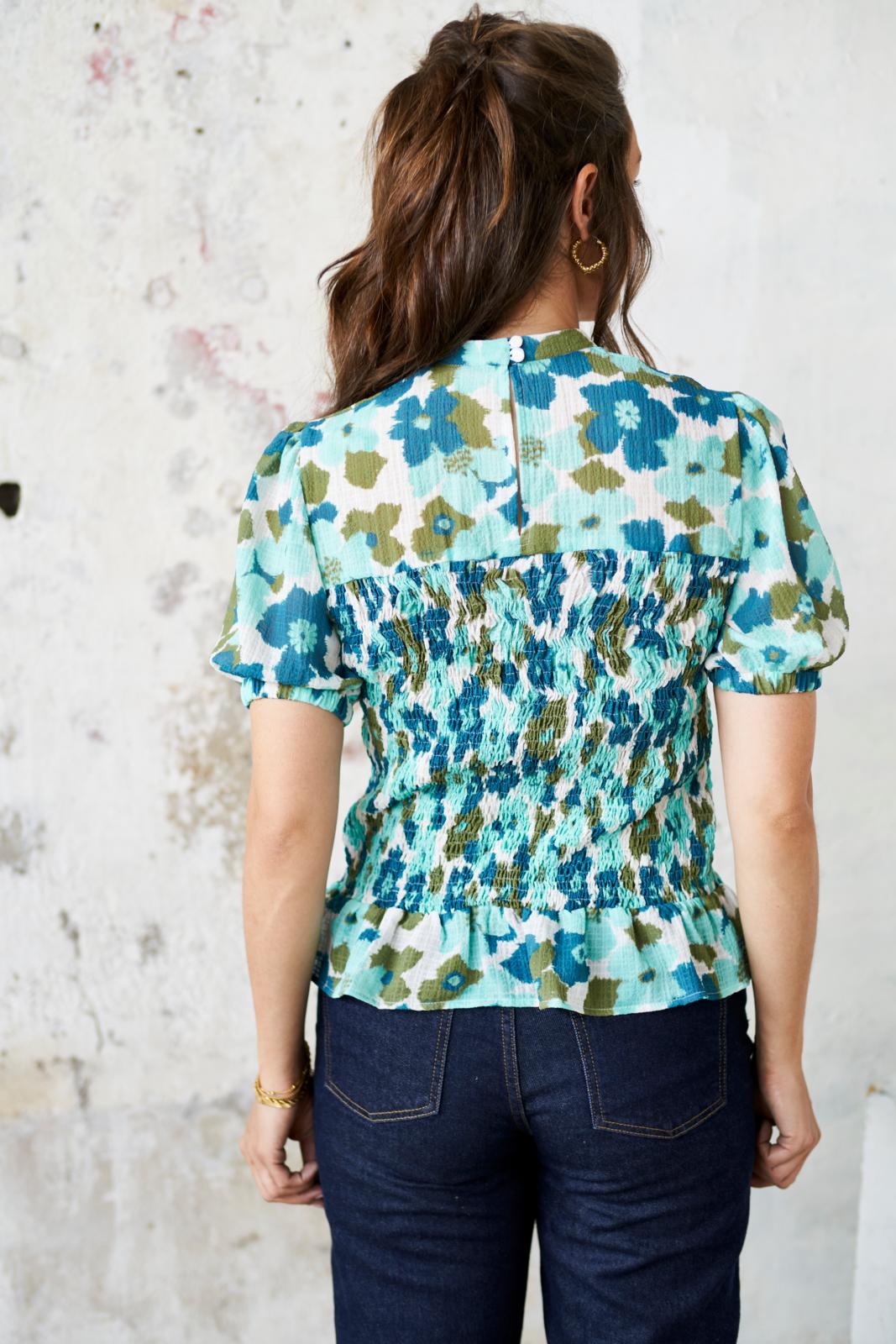 Met deze top met bubbelstructuur én smokwerk ben je wel even in de weer. Maar dan héb je ook een origineel item. De top heeft een opstaand halsboordje met middenachter een split dat sluit met twee knoopjes en lusjes op de boord.