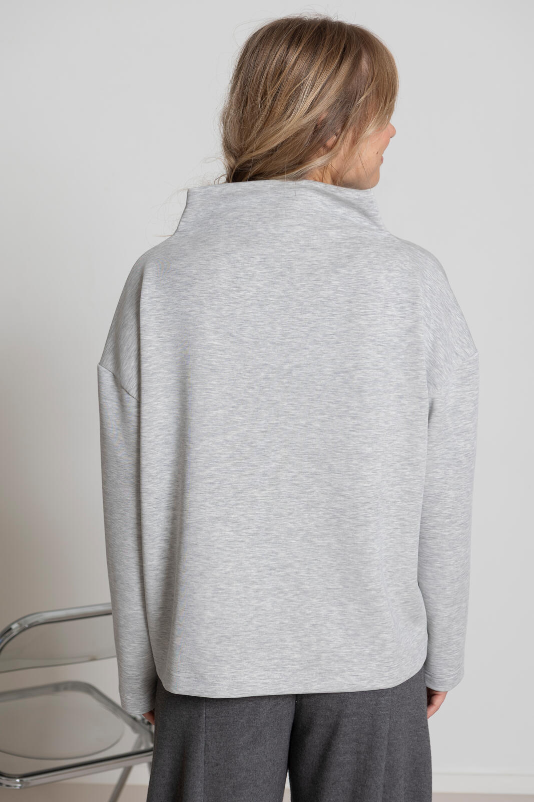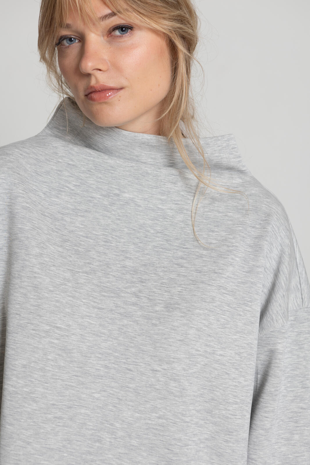 Een nieuw model sweater: prettig oversized en met een verlaagd ingezette mouwen en een brede turtleneck.