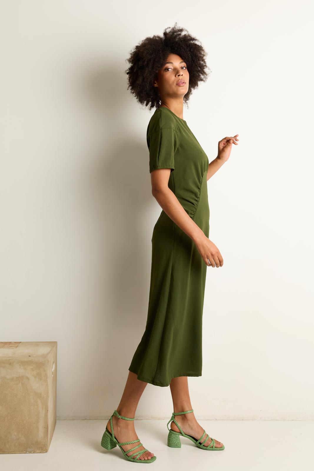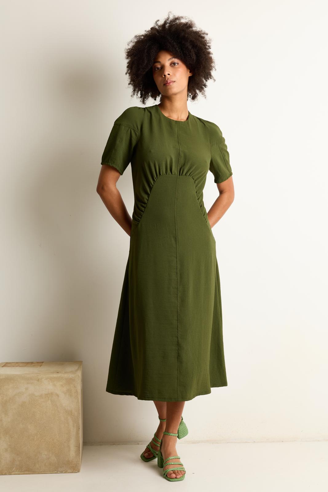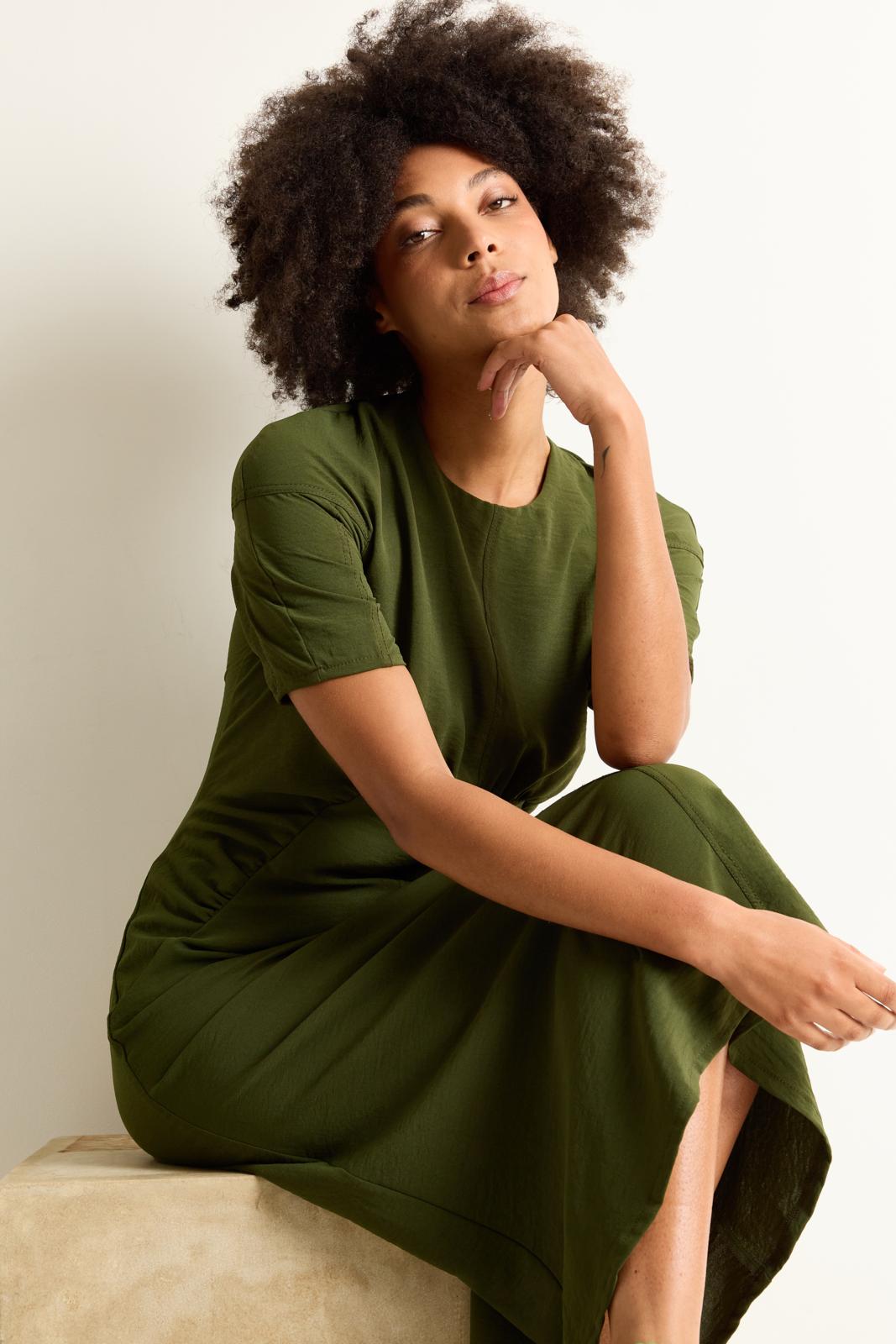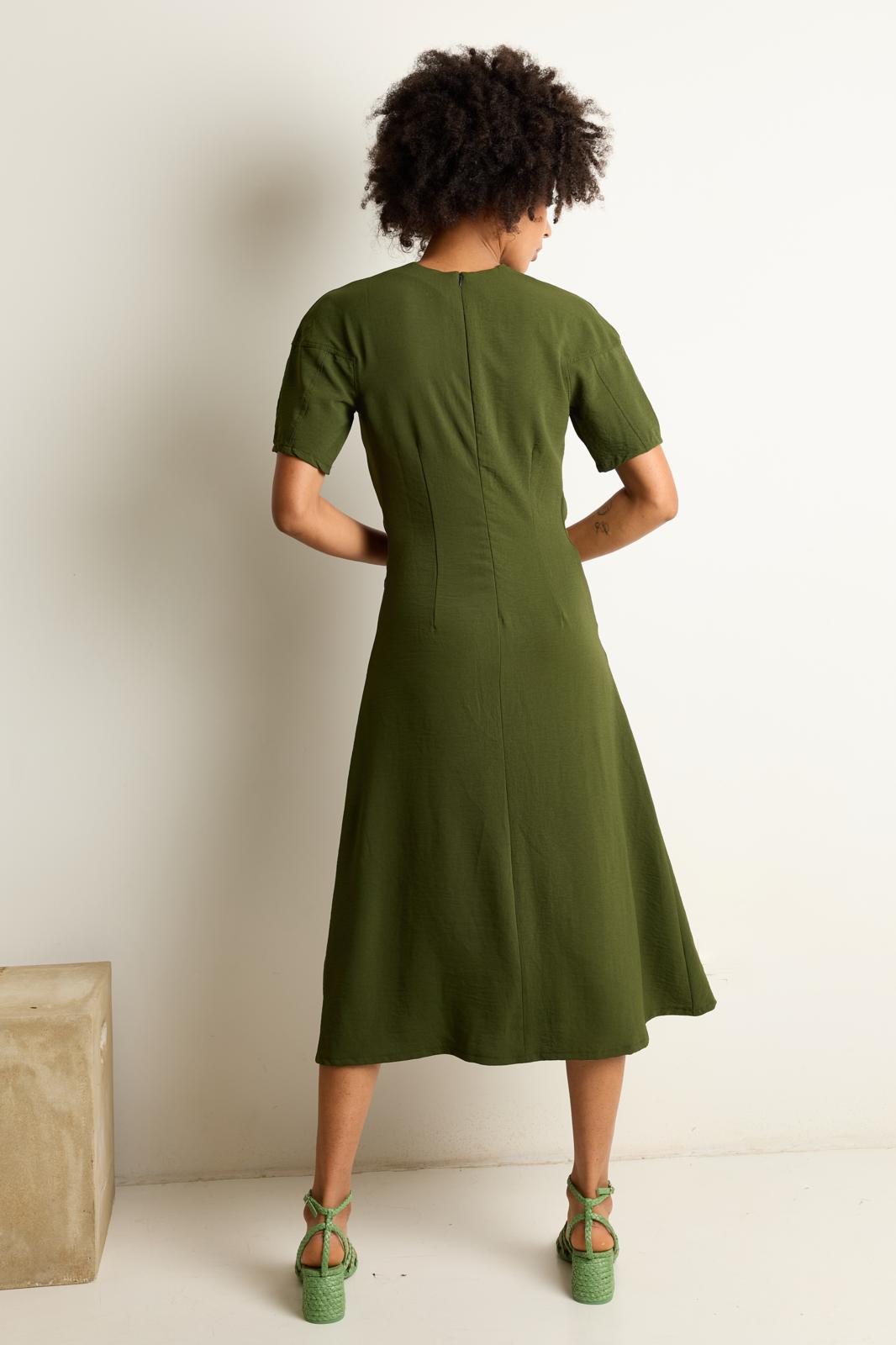 Dit patroon heeft een originele golvende belijning in het voorpand en mooi gevormde mouwen. Door de dubbel doorgestikte naden voor én bij de mouwtjes krijgt deze jurk een casual accent. De katoenen tie-dye stof geeft die leuke zonnige uitstraling met een gekleed tintje.  De groene jurk van crêpeachtige stof draag je het hele jaar door.