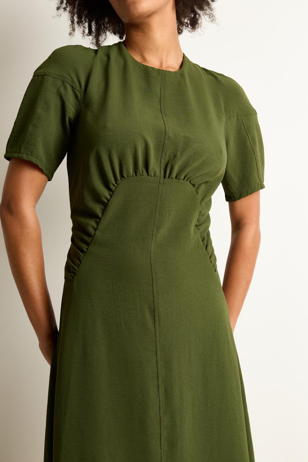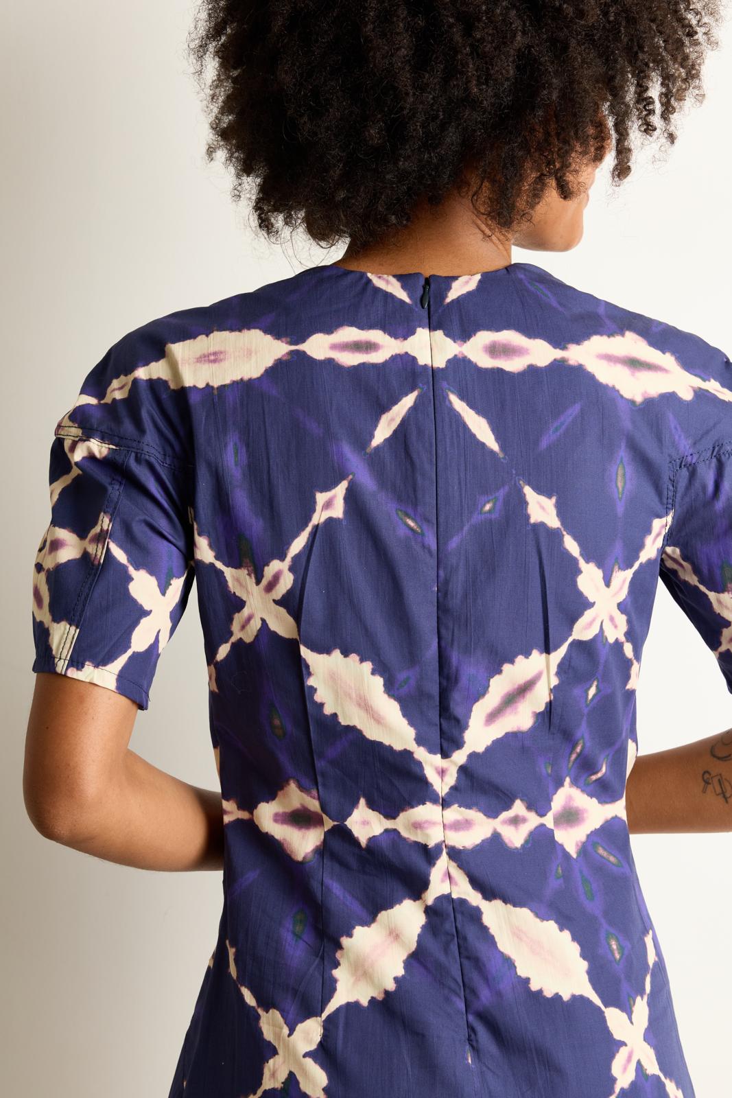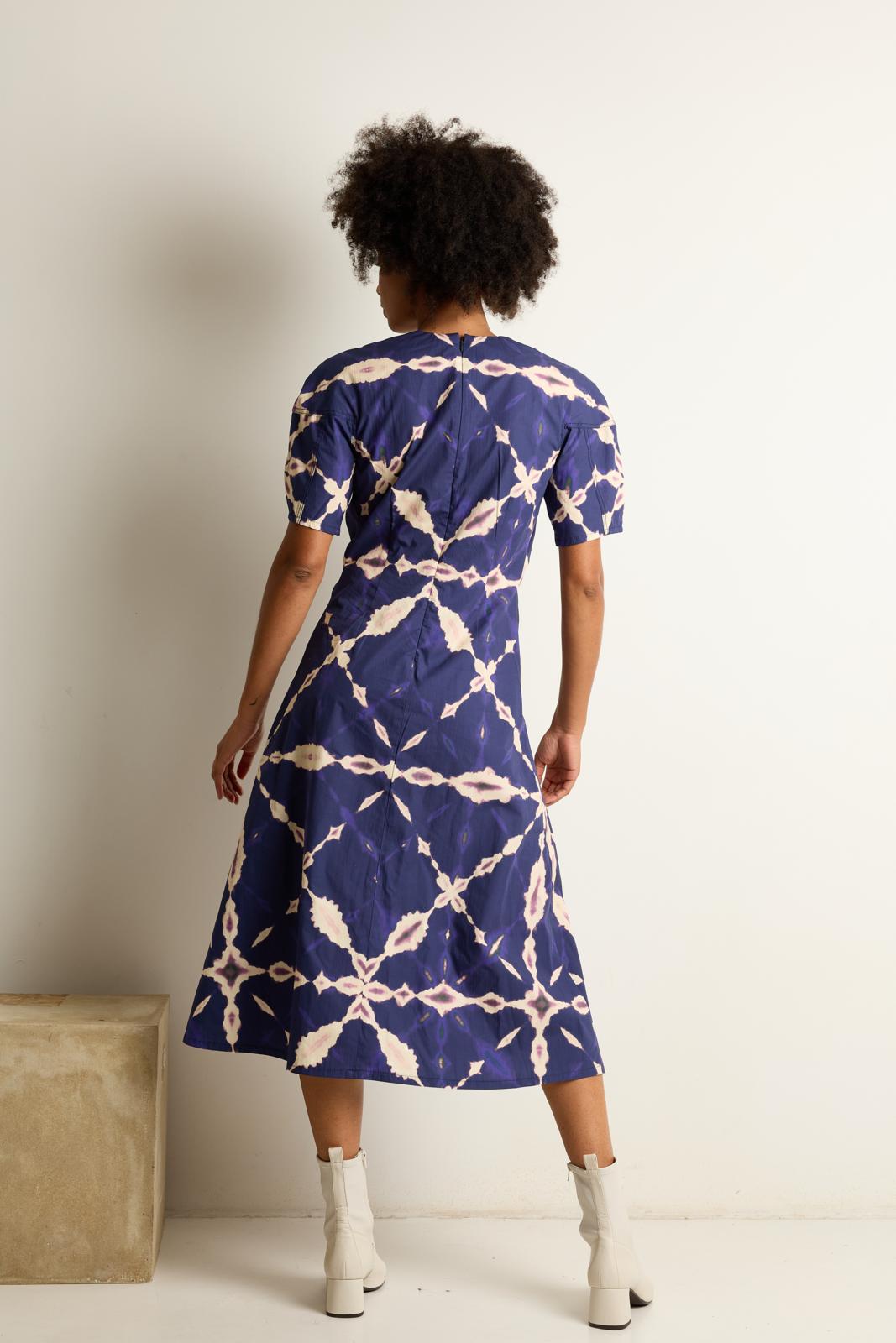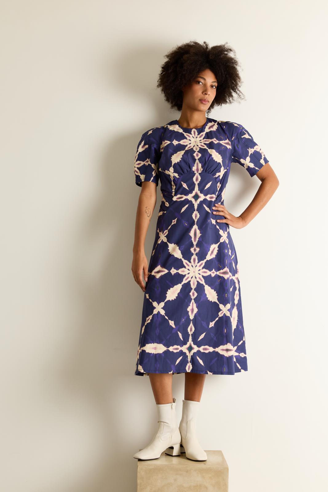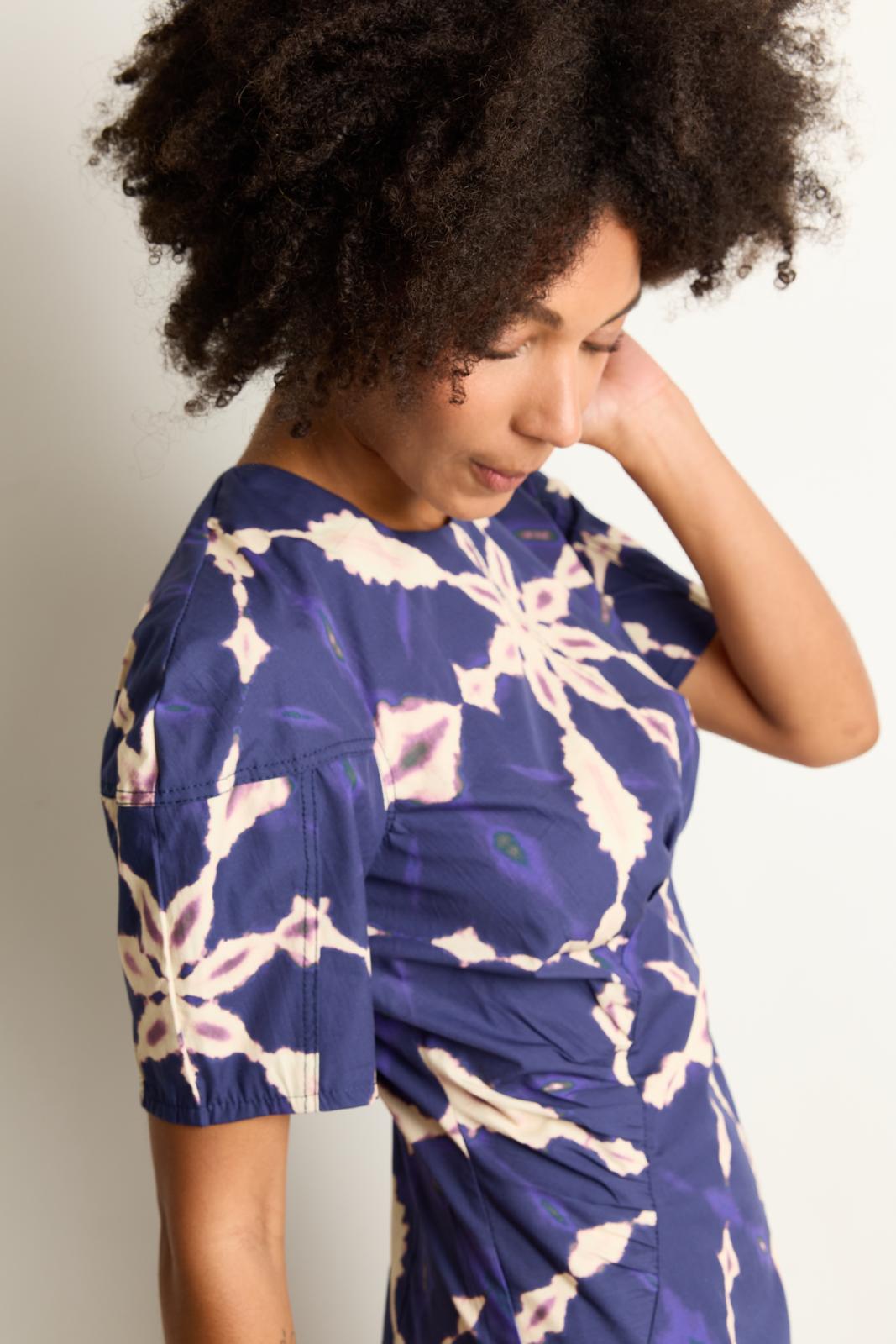 Dit patroon heeft een originele golvende belijning in het voorpand en mooi gevormde mouwen. Door de dubbel doorgestikte naden voor én bij de mouwtjes krijgt deze jurk een casual accent. De katoenen tie-dye stof geeft die leuke zonnige uitstraling met een gekleed tintje.  De groene jurk van crêpeachtige stof draag je het hele jaar door.
