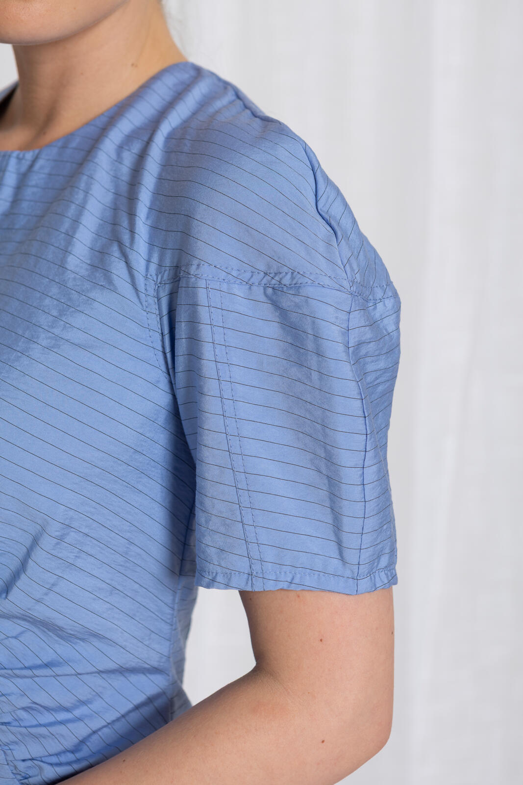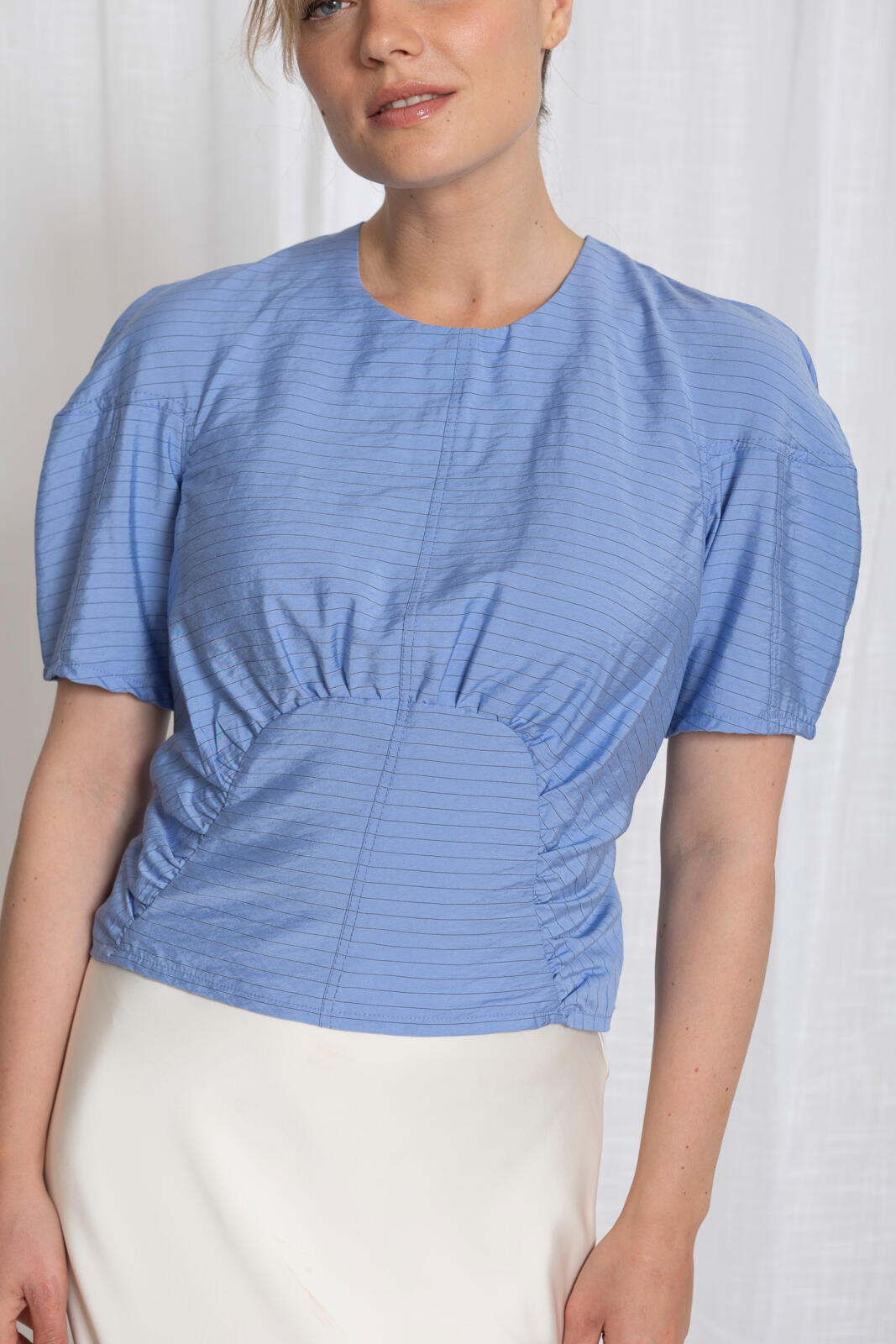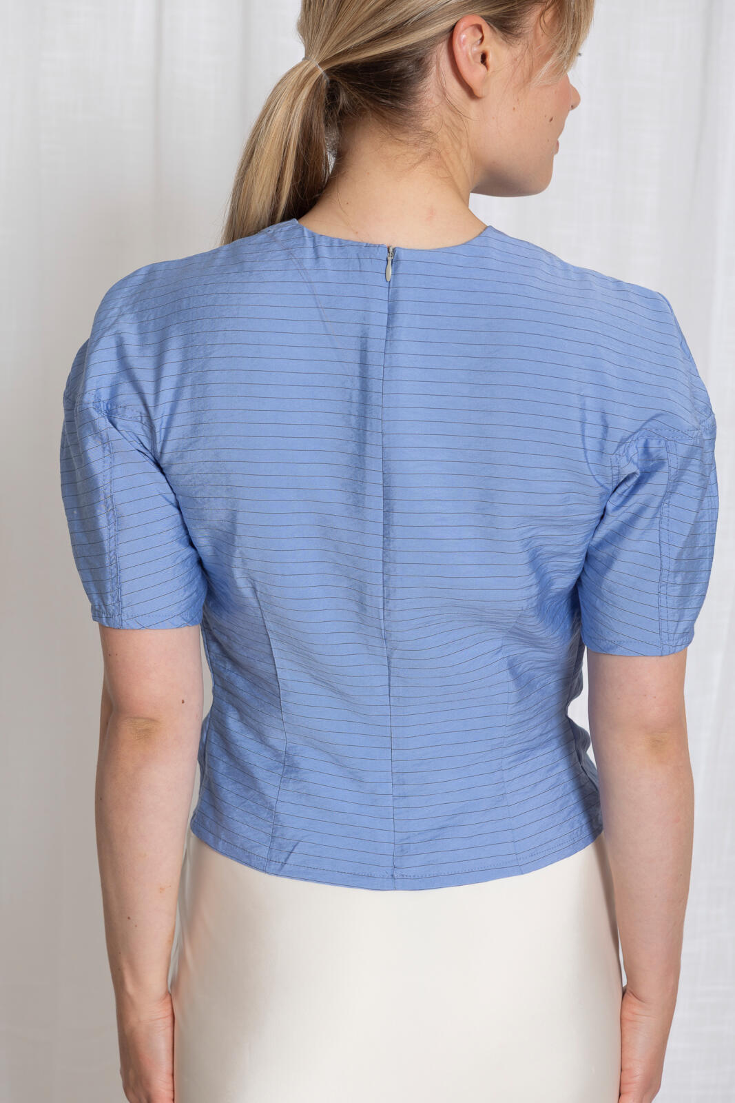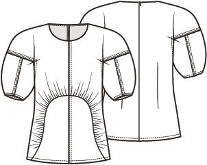 Het ronde ‘taillestuk’ met de voorpandjes rondom eraan gerimpeld en de mooie verwerking van de mouwtjes, maakt van dit model een topstuk. De top heeft middenachter een blinde ritssluiting.