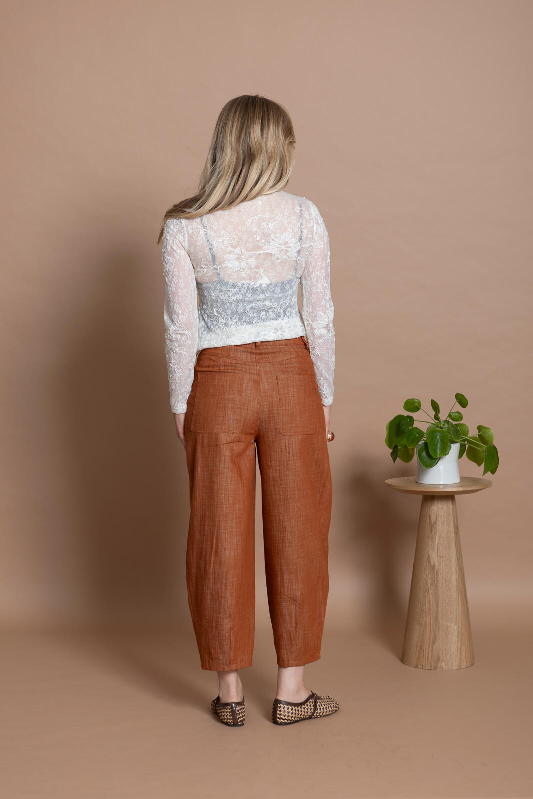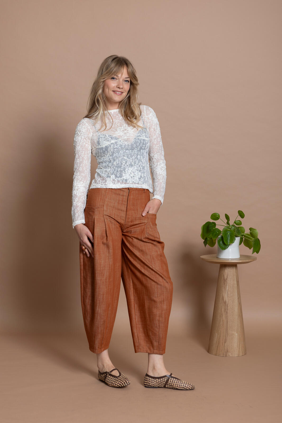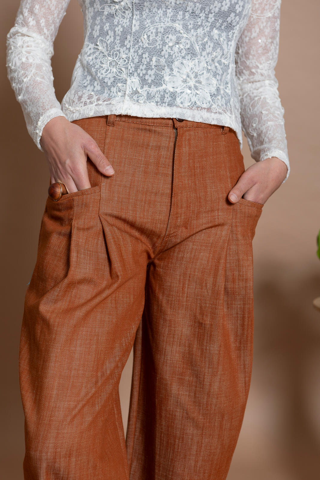 Deze broek van gekleurde denim, is een 7/8ste trendmodel met een ‘rond silhouet’. Een fijne nonchalante broek met achter een heuppas en opgestikte zakken.