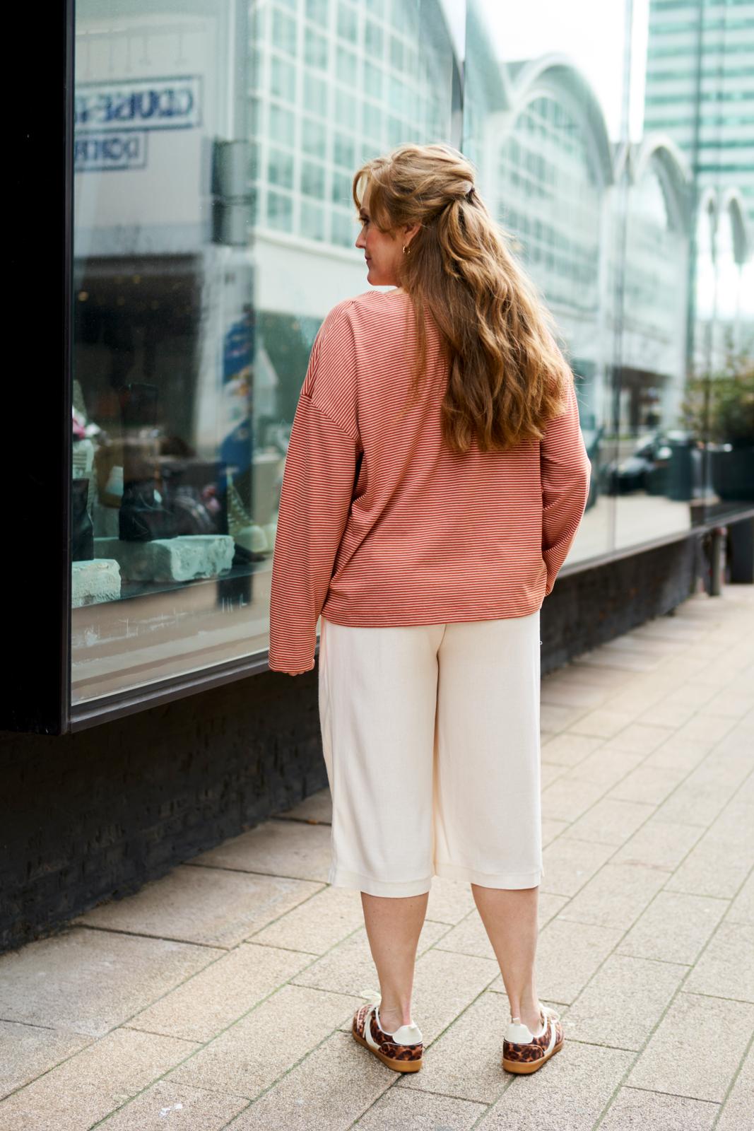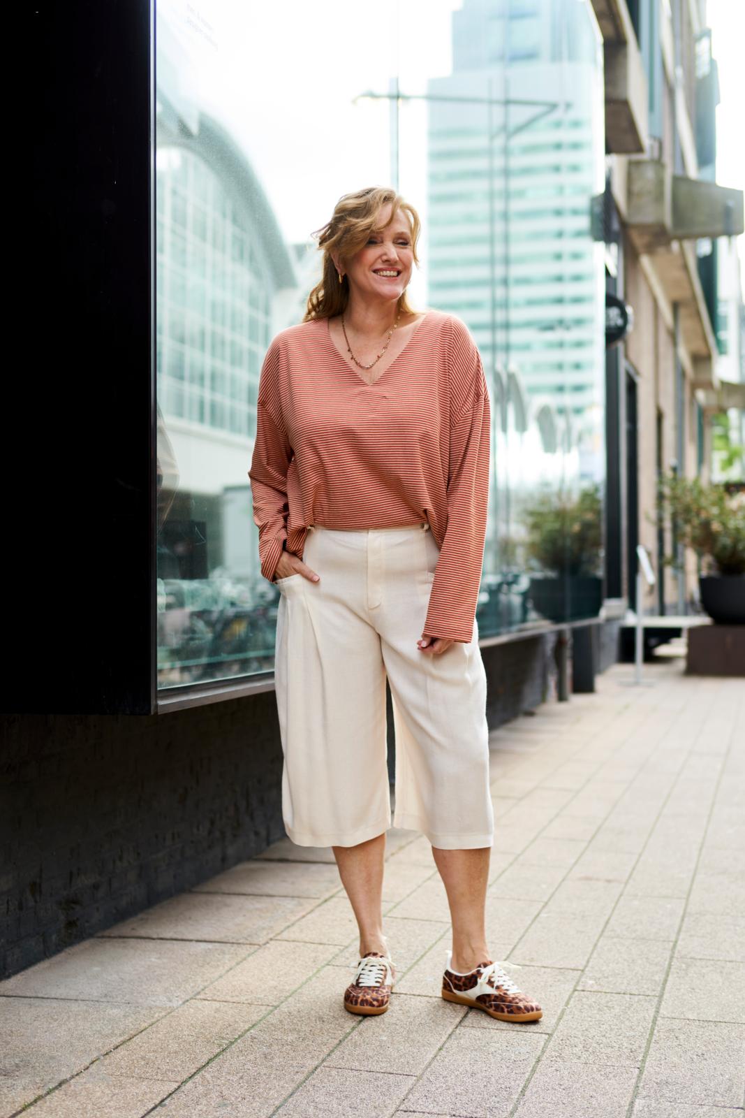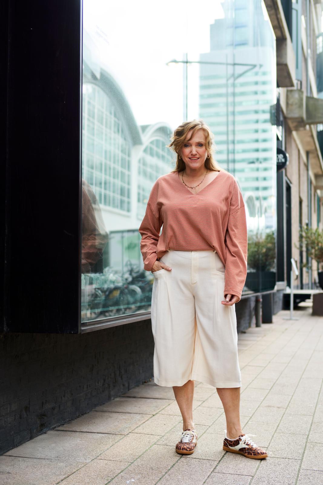 De culotte is hét nieuwe trend­item; deze ‘cropped wide leg’ heeft achter op de tailleband als leuk detaileen riempje met gespje. De zakken met paspelstrook zijn horizontaal verwerkt met een plooi eronder. Je kunt er afhankelijk van je stofkeuze zowel een stoere als nette versie van maken.