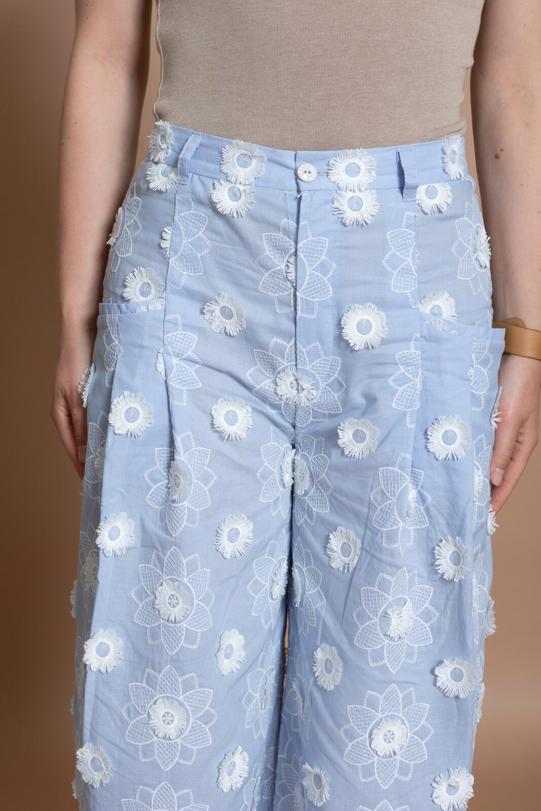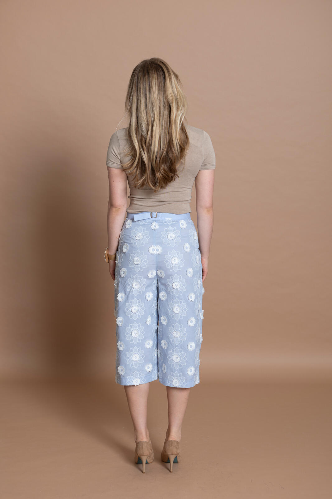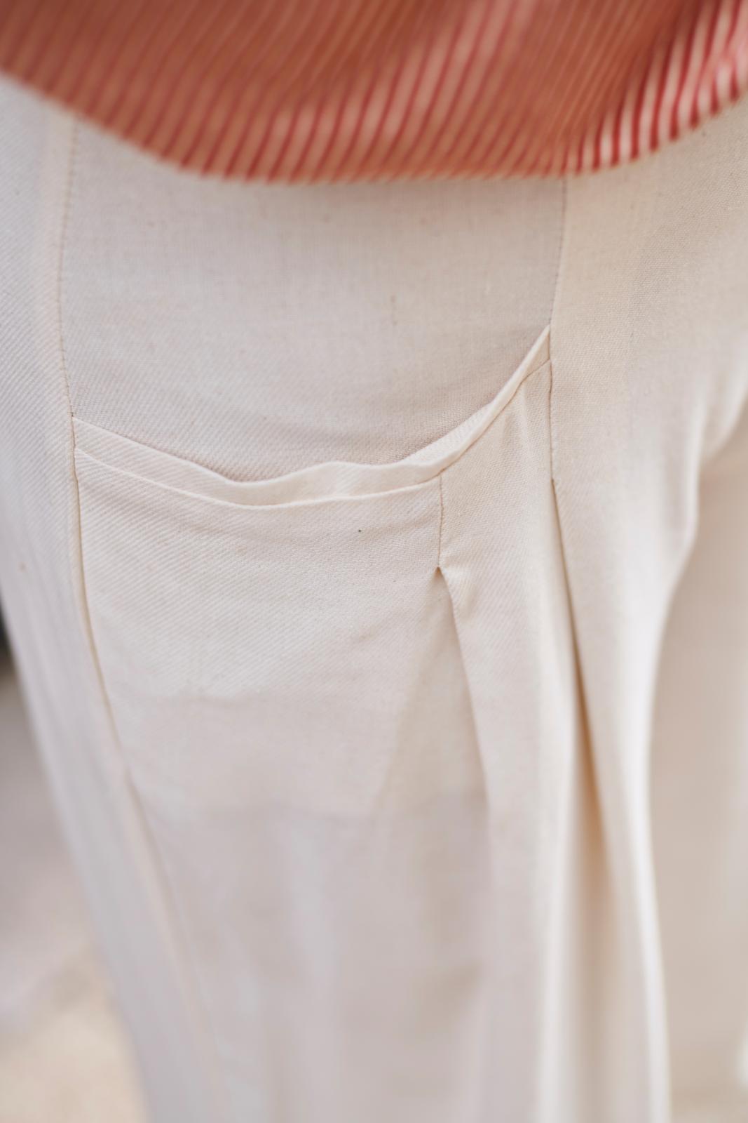 De culotte is hét nieuwe trend­item; deze ‘cropped wide leg’ heeft achter op de tailleband als leuk detaileen riempje met gespje. De zakken met paspelstrook zijn horizontaal verwerkt met een plooi eronder. Je kunt er afhankelijk van je stofkeuze zowel een stoere als nette versie van maken.