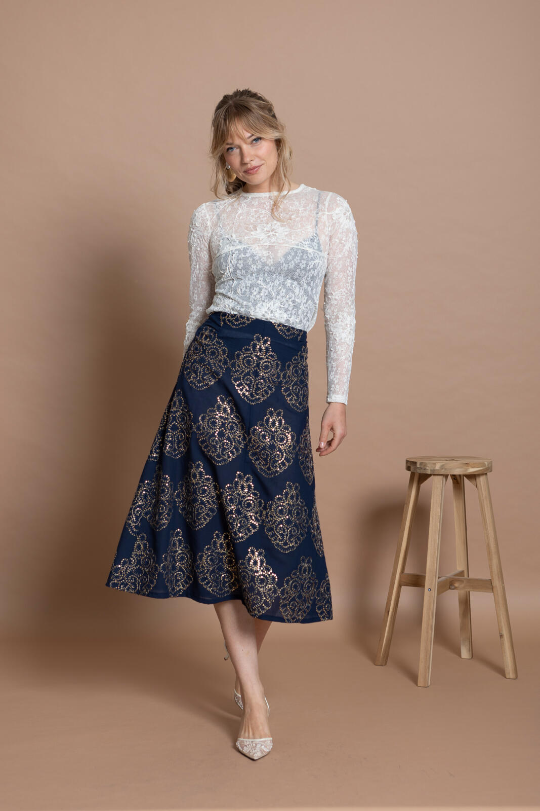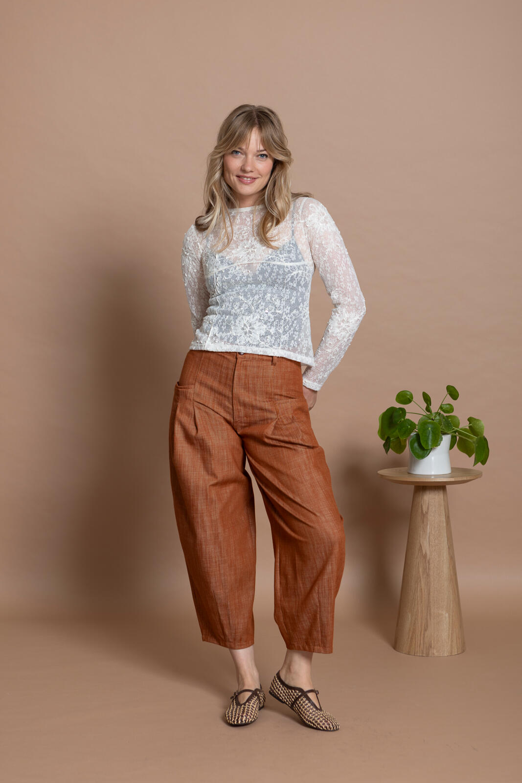 Zo’n longsleeve van romantisch stretchkant staat eigenlijk overal bij. Dit model heeft een speciale belijning met deelnaden en wordt ook mooi van mesh (gaastricot). Een basic met wat extra’s!