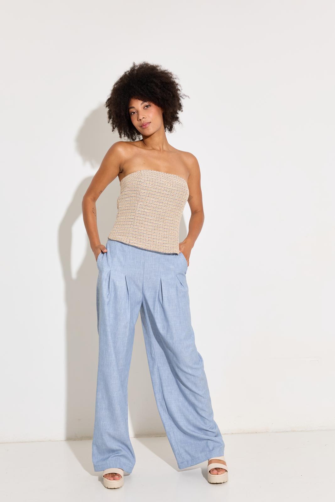 De bustier – met rits in de zijnaad – krijgt een klassieke draai door de tweedstof. Stik eventueel baleinenband in de zijnaad voor extra stevigte.
