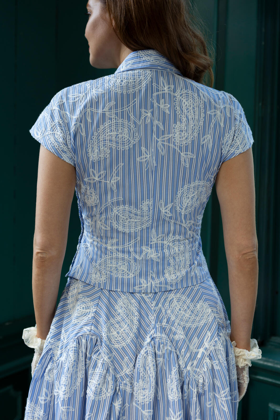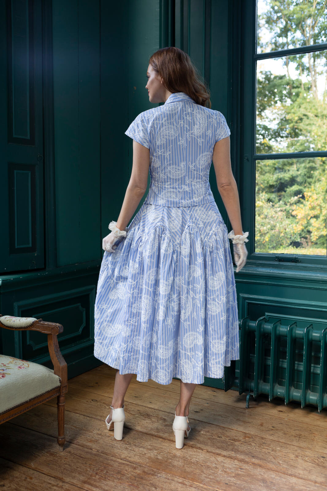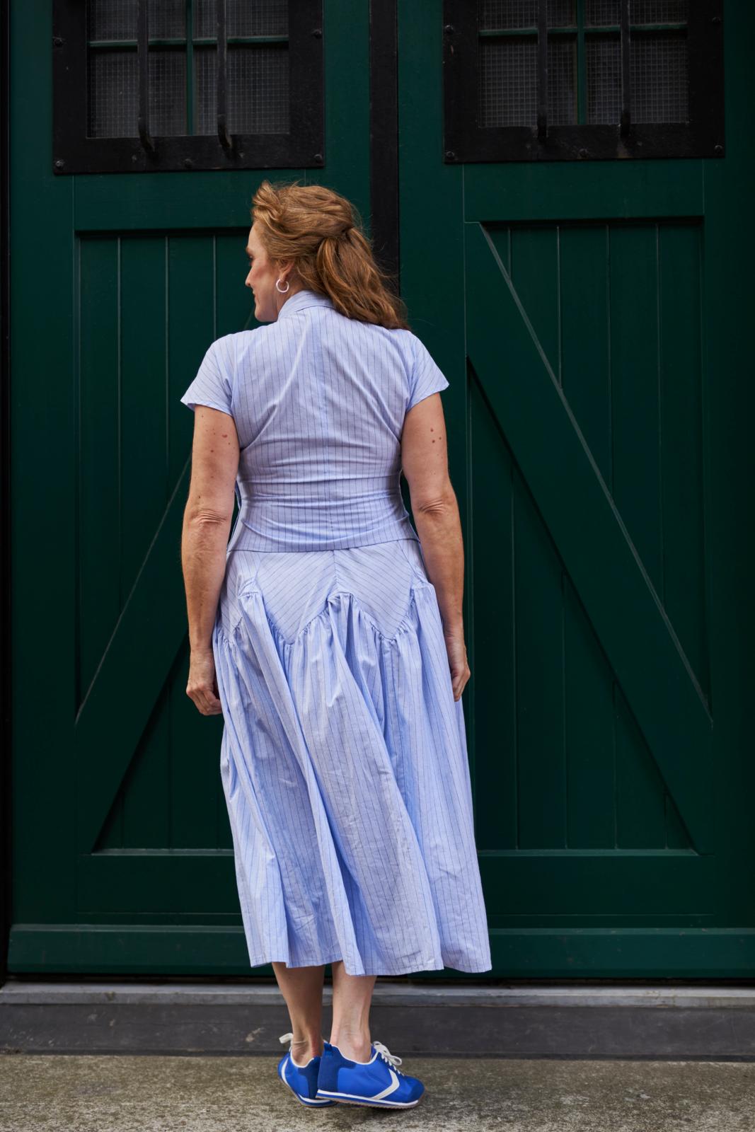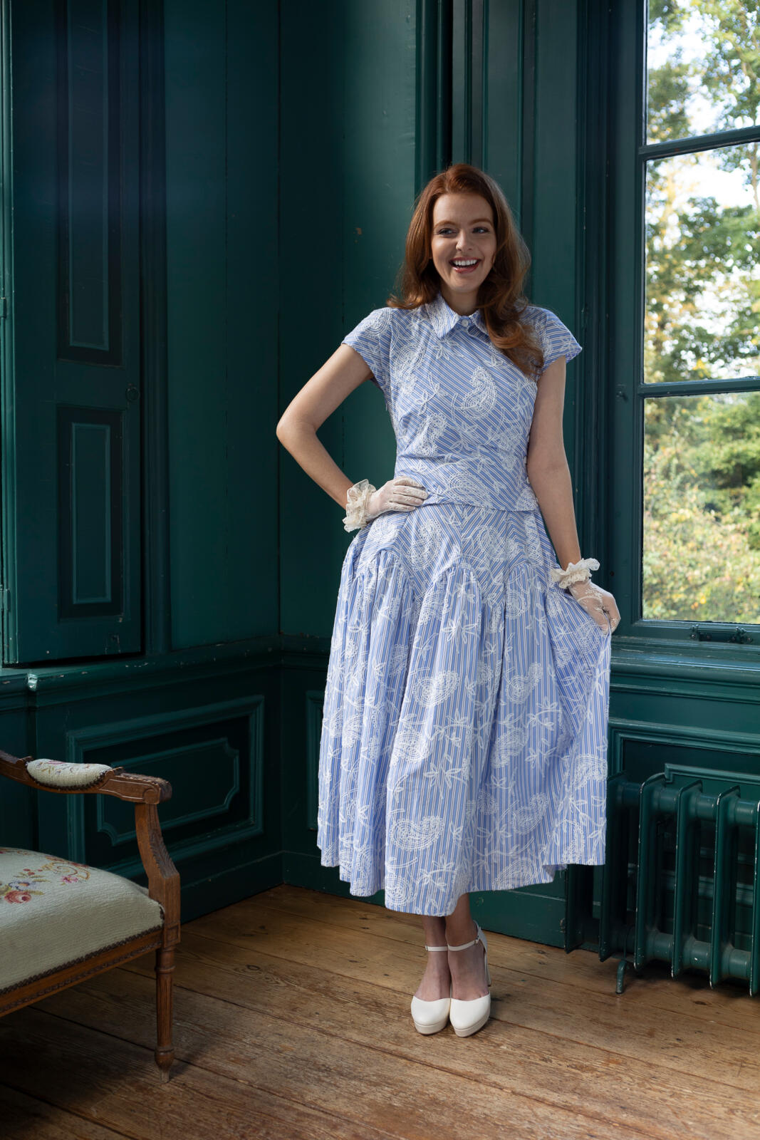 Deze jurk met stijlvolle fifties-vibe heeft een aansluitend overslaglijfje met een knoopsluiting in de zijnaad. Het rokdeel is aan een heupstuk van puntige pandjes gerimpeld. Daarbij krijgt deze jurk een blinde rits in de rechterzijnaad om er makkelijk in te kunnen.